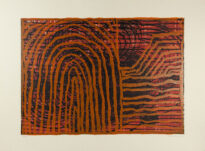 Gravura apresentada na horizontal, possui fundo com sucessão de linhas na vertical e horizontal de ponta a ponta da gravura em tom de vermelho. Em sobreposição há linhas horizontais em tom de preto de ponta a ponta sobre toda a superfície da gravura, e várias circunferências concêntricas também em tom de preto. Em última camada de sobreposição sobre tom de laranja, ao lado esquerdo há sucessão de linhas côncavas da parte superior à inferior; na parte esquerda inferior há linhas retas na horizontal; na parte superior direita há linhas retas com quebras para a diagonal, por fim a gravura apresenta contorno na borda. Obs.: Tiragem 3/13.