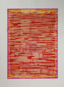 Gravura apresentada na vertical, possui fundo de cor rosa, com sobreposição de cor de vermelho e dois tons de amarelo. Os tons de vermelho e amarelo preenchem a gravura de maneira a formar um retângulo na vertical, e em sobreposição há várias linhas grossas na horizontal de cor amarela sobre toda a superfície da gravura. Obs.: Tiragem 5/6.