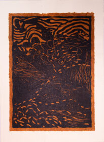 Gravura apresentada na vertical, possui fundo de cor marrom alaranjada. Há uma sobreposição em tom de preto com vazamentos sobre toda a superfície da gravura deixando apenas uma margem para a borda com a cor de fundo. Na camada de tonalidade preta com vazamentos, sobre a parte superior possui linhas onduladas; ao centro no lado esquerdo e direito há pequenos traços retilíneos e curvilíneos em diferentes sentidos; na parte inferior pequenas linhas côncavas com traços grossos. Obs.: Tiragem 5/5