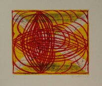 Gravura apresentada na horizontal, ao fundo há quatro triângulos adjacentes nos quatros lados da gravura de cor amarela, distribuídas de maneira que as partes vazadas formam duas linhas cruzadas de ponta a ponta da gravura na diagonal como um "X". Em sobreposição há várias linhas curvas de cor vermelha no sentido vertical e horizontal organizadas de forma concêntrica. Obs.: Tiragem 1/1