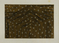 Gravura apresentada na horizontal. A camada ao fundo possui cor de tom marrom com vazamentos em formas de bolhas sobre toda a gravura. Em sobreposição a ele, sobre toda a parte inferior se extendendo até a parte superior em direção ao centro há linhas de cor preta em amplos sentidos que começam na vertical e terminam em diagonal de maneira que as linhas se encontram no centro da gravura. Já na parte superior ao lado esquerdo e direito há linhas na horizontal. Obs.: Tiragem 2/10.