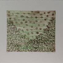 Gravura apresentada na horizontal, ao fundo partindo da base superior em direção ao centro da gravura possui pequenas bolhas de cor preta organizadas de maneira a formar um "relevo do tipo depressão"; na base inferior há vários pequenos traços retos de cor preta organizados de maneira a formar uma onda em consonância à "depressão" das bolhas na parte superior. Em sobreposição possui uma sucessão de linhas na horizontal, em sua maioria de ponta a ponta, na cor verde. Obs.: Tiragem 6/8.