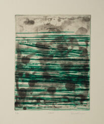 Gravura apresentada na vertical, fundo esfumaçado em tom de preto e em sobreposição há varias linhas na horizontal em sua maioria de ponta a ponta de tonalidade verde. Obs.: Tiragem 9/10