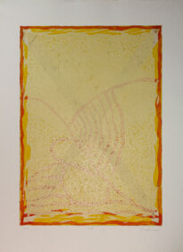 Gravura apresentada na vertical, ao fundo há quatro triângulos adjacentes nos quatros lados da gravura de cor amarela, distribuídas de maneira que as partes vazadas formam duas linhas cruzadas de ponta a ponta da gravura na diagonal como um "X". Em sobreposição há várias linhas curvas de cor laranja do centro para a parte inferior da gravura, e ainda uma camada em tom de amarelo mais claro com vazamentos de pequenos pontinhos. O contorno da borda possui linha grossa de cor laranja. Obs.: tiragem 4/14.