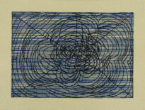 Gravura apresentada na horizontal. Ao fundo de cor preta possui linhas que formam uma borda na gravura; duas linhas na diagonal que se cruzam de ponta a ponta, centralizadas e em direção às bordas há formas em linhas arredondadas organizadas concentricamente. Em sobreposição há linhas na horizontal de ponta a ponta na cor azul. Obs.: Tiragem 8/10.