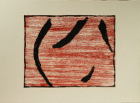 Gravura apresentada na horizontal, possui fundo com uma sucessão de linhas na horizontal de ponta a ponta na cor vermelha. A gravura possui uma borda na cor preta e em sobreposição ao fundo há quatro traços livres, grossos e de cor preta, o maior é o traço curvo que está no lado esquedo da gravura. Obs.: Tiragem 6/7