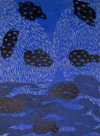 Gravura apresentada na vertical, na parte inferior possui formas abstratas em tom de preto, sobreposição de tom azul com vazamentos em formas de pequenos traços nas laterais esquerda e direita. Possui ainda formas abstratas na cor preta com vazamentos em formato de bolhas. Obs.: Tiragem 1/1.
