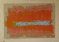Gravura abstrata em cores no modo horizontal. Fundo de cor verde e sobreposição de laranja, em grande parte da superfície há pequenos traços que remetem à figura geométrica quadrada em tom de amarelo. No centro, possui traço na horizontal que remete à forma retangular de cor prata acizentada. Obs.: Tiragem 53/60