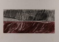 Gravura de composição abstrata em cores apresentada no modo horizontal. A composição é estruturada em dois grandes blocos retangulares sobrepostos, formando uma divisão horizontal. Na parte superior possui uma área em tons de cinza e preto, com textura densa marcada por arranhaduras e linhas verticais e diagonais, que criam a impressão de superfície rugosa. Na parte inferior há uma área em tom de vinho, atravessada por traços que despigmentaram a aplicação de cor em linhas diagonais irregulares, como veios. Obs.: na borda inferior da gravura indica-se sua tiragem "8/50" à esquerda, assinatura da artista "Ostrower" e data de produção "1992" ao centro, escritos a lápis.
