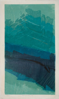 Gravura abstrata em cores no modo vertical, diferentes tonalidades de verde e azul petróleo em gradiente. Possui traço na diagonal em tom de preto no centro inferior. Obs.: Tiragem 14/50