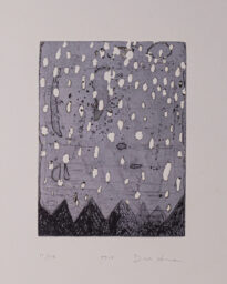 Gravura apresentada na vertical, possui fundo de cor prateada e algumas manchas de cor preta e relevos secos sobre a superfície da gravura. Sobre toda a parte inferior há várias linhas que formam triângulos com pontas para cima. Obs.: Tiragem 11/50.