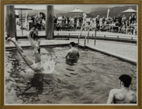 Fotografia em preto e branco de formato retangular e apresentada no modo horizontal. Em primeiro plano há uma piscina com quatro figuras humanas masculinas, com destaque para uma delas que está em posição de mergulho com os membros inferiores elevados e fora da água, enquanto o resto do seu corpo se encontra mergulhado, além de uma figura humana masculina em segundo plano que está sentada em uma pequena elevação do chão e fotografando a cena. Em terceiro plano há uma figura humana feminina desfilando com traje de banho, enquanto ao fundo, em quarto plano há outras figuras humanas assistindo e registrando o momento. No último plano uma paisagem de mar e montanhas