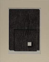 Gravura em preto e branco no modo vertical. Fundo de cor preta, há riscas brancas continuas que se assemelham as sulcos da madeira. Na parte inferior há um quadrado destacado e no lado direito inferior há um quadrado branco. Obs.: Tiragem 1/25