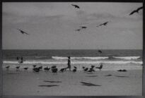 Fotografia em preto e branco de formato retangular apresentada no modo horizontal, em plano aberto possui paisagem de uma praia, com uma figura humana feminina transitando na faixa de areia posicionada ao centro da imagem com urubus ao seu redor, e ao fundo a água com alguns banhistas à esquerda