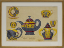 Desenho de jogo de louças para chá e café completo, tendo decorações e design inspirado na figura do pássaro tucano e do fruto do açaí, nas cores amarela, cinza e vermelho vinho e roxo. Da esquerda superior para a inferior temos na ordem: um pires, representado dividido ao meio mostrando ao mesmo tempo a visão superior e inferior do objeto circular, e tendo logo abaixo a visão lateral; a vista de um dos lados da xícara mais estreita, mostrando a área da alça da xícara de frente; e uma leiteira, jarra com somente uma alça lateral. No centro do papel temos a imagem de um bule, de bico longo e curvado, alça lateral alta, base larga e alta e tampa em formato de cúpula superior. No lado direito desta vez, de cima para baixo temos: uma xícara maior, de borda mais larga; a xícara estreita agora vista de perfil, mostrando melhor a alça lateral; e um açucareiro, com duas alças laterais e uma tampa cúpula redonda. No canto superior da direita temos o número 25 escrito em grafite. No centro da parte inferior temos o texto “Apparelho para café, leite e chá. Motivo: Tucano e Assahy. Pastana. Pará – Brasil”. Abaixo, um pouco apagado podemos ver o número 20 em grafite, e da lateral do canto direito, também em grafite, vemos a data e local da obra. A obra está em um passepartout e este em uma moldura de vidro.