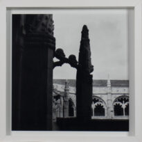 Fotografia digital em preto em branco em modo horizontal, em primeiro plano da esquerda para o centro da imagem há detalhe de coluna decorativa, ao fundo vista de claustros