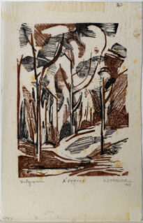 Gravura em cores no modo vertical, possui traços e formas que representam figuras de vegetação de porte arbóreo nas cores marrom e preto. Obs: no canto inferior esquerdo possui escrito "xilogravura", no canto inferior central "Árvores", no canto inferior direito possui "OSTROWER" e abaixo "1948"