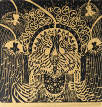 Gravura na cor preta, fundo formado por formas geométricas retangulares e circulares organizadas,. No centro possui figura humana com desenhos sobre o colo e o rosto, remetendo assim a um símbolo de adoração. Na parte superior há cinco figuras semelhantes botões de flores iluminados, dois no lado direito e dois no lado esquerdo, no centro a flor fica por cima da cabeça da figura humana da imagem