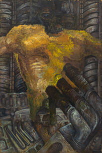 Pintura em cores no modo vertical. Fundo de tons escuros com figuras semelhantes a ferragens. No centro há uma concentração de cor amarela que se torna uma figura semelhante a humana, na parte que seria o rosto é predominantemente marrom e cinza