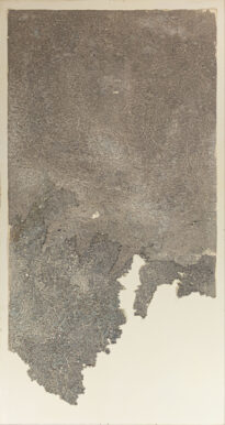 Construção artística abstrata em modo vertical, aparenta ser papel reciclado, cores predominantes em branco, azul e cinza.