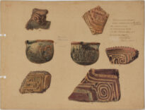 Desenhos de diversas peças e fragmentos de cerâmicas marajoaras com motivos geométricos, respectivamente numeradas com numerais romanos e legendadas no canto superior direito. De cima para baixo, da esquerda para direita, temos a peça III, denominada na legenda como “cabeça de ídolo”; IV como “fragmento de tanga”; I e II sendo “pequeno vaso (Carlos Estevão)”, sendo que entre as duas vistas do objeto temos o nome “Marajó” e uma seta indicando “Fazenda Severino” em grafite; VII, V e VI são denominados “Fragmentos de louça” e todos os desenhos são pintados de tons terrosos, escuros e ocres. Na legenda vemos abaixo das numerações respectivas “(de m/ propriedade)” seguido da assinatura, local e data. No canto superior esquerdo vemos 60 em rosa quase apagado e no canto superior direito o número 60. No verso o número 60 na vertical, em grafite, localizado no canto inferior direito.