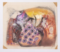 A pintura apresenta elementos ao centro da obra com formas orgânicas e geométricas sobre fundo em tons de laranja e amarelo. Destaca-se uma figura arredondada em laranja, coberta por padrões de losangos roxos, ao lado de manchas em roxo, branco e preto. À direita, há um elemento em vermelho.