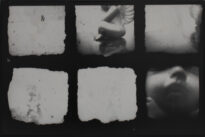 Fotografia preto e branco em modo horizontal, possui seis com mini paisagens a partir da perpesctiva dos buracos do tijolo. Possui detalhes de uma figura de uma escultura de anjo em diferentes posições e perspectivas