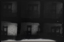 Fotografia preto e branco em modo horizontal, possui seis com mini paisagens a partir da perpesctiva dos buracos do tijolo. Possui cadeiras em diferentes posições e perspectivas na imagem