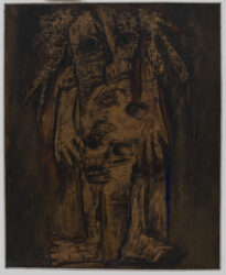 Pintura em cores no modo vertical. Fundo nos tons de marrom e preto, no centro há figura com três rostos humanóides com braços e pernas sobrepostos em cor marrom claro