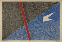Apresentada na horizontal, no centro da obras uma listra vermelha, lado esquerdo de cor preto e lado direito de cor azul. Um vazamento que remete uma fígura de uma bandeirinha. OBS.: No verso possui as seguintes inscrições: na parte inferior esquerdo "4.2775" ; um adesivo escrito: "523" ; "MEP-99/01.3/0038-BC ; "COMPOSIÇÃO COM UMA BANDEIRINHA - 57/100" ; "VOLPI, ALFREDO" ; "GRAVURA - 43 X 63,5 - SERIGRAFIA". Na parte inferior direito, dois selos com: "Inventariado Dez/89" ; "Jun/90" "106654-4" ; "0229"