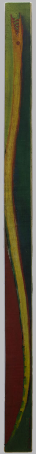 Pintura em cores em uma tábua, fundo de cores em tons de verde e vermelho, há o desenho de uma serpente amarela com contorno vermelho, a boca aberta com os dentes aparecendo