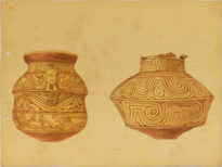 Desenho de duas urnas de cerâmica arqueológica em aquarela alaranjada com detalhes geométricos e linhas onduladas de traços mais escuros. A urna da esquerda possui um aplique central com figura antropomorfa, enquanto que a urna da direita está com a borda superior quebrada. Na borda superior esquerda, em rosa, podemos ver o número 71 e na borda direita superior novamente o número 71 escrito em grafite fraco. Ao redor dos objetos retratados podemos ver pequenas anotações em lápis grafite preto, com números e medidas referentes a tais objetos. Da esquerda para a direita, ao redor do vaso esquerdo podemos ler “nº 10”; “0,21⌀”; “16½ cm ⌀”; “altª 34½ cm”. Ao redor do vaso direita, temos “0,18⌀”; “039⌀”; “nº3”; “alt. 0,31”. No canto inferior direito está a assinatura do artista em grafite. No verso existe uma inscrição em grafite, na vertical que diz “Geografia botânica: “Contribuição a geografia botânica no litoral da Guiana entre o Amazonas e o Oiapoque” pelo Dr. Jncques (?) Huber (boletim do Museu Paraense, Tomo I. No canto superior direito, está escrito nº 71 de grafite quase apagado, e ao mesmo tempo, de ponta cabeça e com grafite mais pigmentado o número 71 está localizado no canto inferior direito do papel