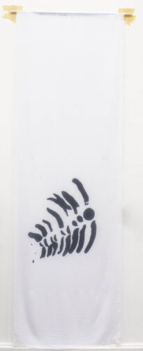 Tecido translúcido estapamado com desenhos produzidos com “pincel de luz”,