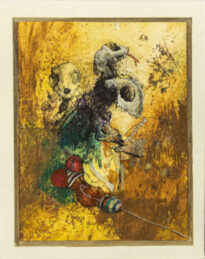 Pintura em cores no modo vertical, fundo de variadas tonalidades de amarelo, ocre e marrom. No centro possui 3 figuras de esqueletos caninos tocando algo semelhante a um instrumento de teclas. Na parte superior há uma isca de anzol com forma de um corpo feminino humano