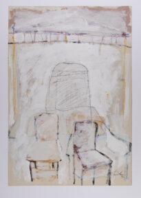 Pintura em orientação vertical, apresenta na parte inferior central da pintura uma cadeira com coloração amarela à esquerda e uma cadeira com coloração vermelha à direita, em sobreposição há uma camada de tinta branca por toda superfície da pintura que permite a visualidade dos elementos sobrepostos. Da parte central à superior da pintura, com o auxílio da técnica de desenho, há elementos que sugerem a ambientação de uma sala com perspectiva de fundo atrás das cadeiras. Na parte superior há duas faixas de cores na horizontal, com inscrições sugestivas de algarismos romanos. Assinatura do artista e datação da obra localizada no canto inferior direito da pintura. Obs.: no verso há a inscrição em lápis "0354-TB".