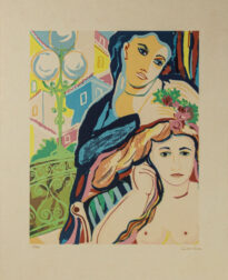 Gravura apresentada na vertical. Tons de verde, azul e amarelo. À direita possui duas fíguras humanas femininas, o rosto sem expressão. A de baixo está sem roupas revelando os seios e com flores na cebeça. A de cima está de roupa azul e seguranda as flores com as duas mãos. O lado esquerdo possui casas na cor azul e amarelo, um poste de rua com três luminárias, seguindo de uma grade na cor verde. Obs.: tiragem 01/50 ; No verso Inventáriado Jun/90 ; 107 7619 ; MEP .99/01.3/0042-06 "DUAS MOÇAS COM CASAS AO FUNDO" - 1/50 ; DIAS CÍCERO ; GRAVURA - 64 X 43,8 - SERIGRAFIA "?" ; Inferior esquerdo adesivo 527 ; A.5198