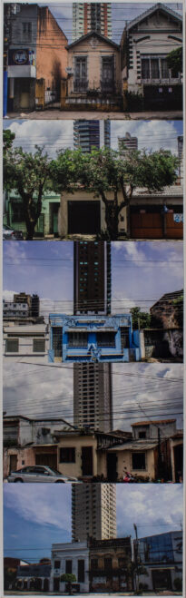 Fotografia em cores apresentada no modo vertical. Possui colagem de cinco fotografias com fachadas de imóveis antigos enquadradas de modo que um prédio fique centralizado ao fundo desses imóveis. Destaque da primeira imagem de casa de cor salmão, destaque da segunda imagem de casa de cor bege, destaque da terceira casa de cor azul, destaque da quarta imagem com casas de cor bege, destaque da quinta imagem com casa de cor branca e casa abandonada de cor amarela