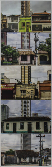 Fotografia em cores apresentada no modo vertical. Possui colagem de cinco fotografias com fachadas de imóveis antigos enquadradas de modo que um prédio fique centralizado ao fundo desses imóveis. Destaque da primeira imagem de casa de cor verde limão, destaque da segunda imagem de casa de cor rosa, destaque da terceira casa de cor amarela, destaque da quarta casa com detalhe de pintura na cor azul turquesa, destaque da quinta casa de cor branca