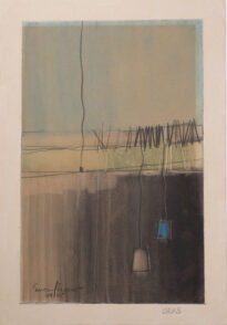 A obra apresenta uma composição onde na parte superior predominam tons esverdeados e azulados, seguidos por uma faixa bege que se estende horizontalmente acima de uma linha em verde. Logo abaixo, uma ampla área em preto ocupa a parte inferior. Linhas finas em preto e branco atravessam a obra de cima para baixo e também na horizontal, algumas mais soltas e irregulares, outras agrupadas em padrões repetidos. Dois elementos geométricos pequenos aparecem como se estivessem suspensos na metade inferior: um quadrado azul e um quadrado bege, ambos delimitados por linhas finas. A assinatura do artista está localizada no canto inferior esquerdo.