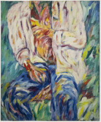 Pintura em cores no modo vertical, fundo de pinceladas largas nas cores azul, verde, roxo e amarelo. No centro há o corpo de uma figura humana masculina sentada, trajando calça jeans e camisa branca aberta no peito