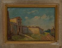 Pintura a óleo na horizontal de uma paisagem de uma lateral da Fortaleza de Macapá, tendo do lado direito uma estrada de terra. A moldura apresenta rachaduras e oxidações e manchas. No verso existem inscrições, sendo a maior "Salão de 1962". Existem duas etiquetas se soltando do verso.