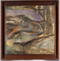 A imagem mostra uma pintura enquadrada em madeira, representando um grupo de peixes em movimento horizontal, sugerindo o ato de nadar. As formas dos peixes são alongadas e sobrepostas, com tons predominantes de marrom, cinza, laranja, lilás e azul esverdeado. O fundo é texturizado e apresenta uma aparência de rochas ou água turva, com variações de cor e linhas que reforçam a sensação de movimento. No canto inferior esquerdo, há uma forma circular amarelada que pode remeter a um sol ou reflexo luminoso. A obra está assinada no canto inferior direito, acompanhada do ano “89”.