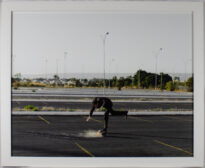 Fotografia em cores no modo horizontal, em um ambiente com céu claro há um estacionamento para carros vazio e a posicionada ao centro da fotografia há uma figura humana masculina que traja terno de cor preta, e que está com o seu tronco e braços inclinados para baixo fazendo menção a algo que deixou cair, e no chão se encontrauma pedra próximo de seu pé