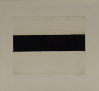 Gravura em preto e branco quadrada. Fundo de cor branca, há listra preta no centro.