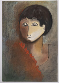 A imagem apresenta uma pintura com fundo em tonalidades que variam entre verde, marrom e cinza. No centro há um rosto de figura humana com cabelos curtos em cor escura, olhos grandes delineados em preto, nariz e boca pequenos. A face é dividida em duas áreas de coloração distintas, uma mais clara à direita e outra em tom mais escuro à esquerda. Do lado esquerdo, abaixo do rosto, há uma área em tom avermelhado que se espalha em formas irregulares pela superfície. O contorno dos ombros e parte superior do tronco da figura estão desenhados com linhas finas e escuras. No canto inferior direito há a assinatura do artista acompanhada de data.