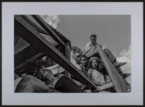 Fotografia analógica em preto e branco apresentada no modo horizontal, possui duas figuras humanas feminina e masculina se beijando no canto esquerdo. Três figuras humanas masculinas e duas infantis no canto direito observando a cena