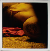Fotografia em cores no modo horizontal. A imagem possui foco em figura humana masculina deitada no chão, há um pano de coloração vermelha em baixo da cabeça que está levemente virada para o lado, ficando à mostra sua nuca, seu braço possui tatuagem de figura religiosa cristã de Jesus Cristo