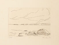 Gravura apresentada na horizontal. Em primeiro plano possui rochas sobre um rio. No fundo tem-se um horizonte semlehante a uma praia, com nuvens e a representação de uma cidade com um porto no lado esquerdo. Obs.: tiragem 21/25 ; No verso MEP-99/01.3/0019-BC Ponta de Areia 21/25 Marinha Artes Visuais, Babinski Calcografia, 27 x38 ; no centro A 2382 ; Esquerda inferior Adesivo 502 ; selo invemtáriado Jun/90 ; 105.0575-3
