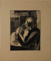 Gravura em preto e branco no modo vertical. Possui traços e formas que remetem a uma figura humana feminina de perfil com o rosto sombreado e segurando uma figura humana com poucos meses de vida em seu colo. Obs.: Tiragem 3/50