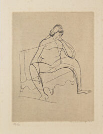 Gravura apresentada na vertical. Possui uma figura humana na qual o título sugere uma mulher sentada no sofá, seu braço esquerdo apoiando sua cabeça, o braço direito sobreposto ao joelho direito, com as pernas abertas. Obs.: tiragem 45/80. No verso da obra possui as seguintes inscrições: Na parte superiror esquerdo: "MEP-99/01.3/0029-BC" ; "MULHER SENTADA NUM SOFA" ; "CLOVIS GRACIANO" ; "GRAVURA-CALCOGRAFIA" ; "24x18 - ?". Na parte inferior: "6018 MEP 105.715-4 1194 inventariado dez/90 e jun/90 mulher sentada num sofá".